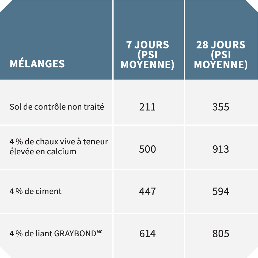 D’après les résultats des tests, la famille de liants GRAYBONDMC mis au point par Graymont a démontré une résistance supérieure au ciment et pourrait être utilisée comme liant de rechange au ciment et à la chaux pour le traitement de certains types de sol.